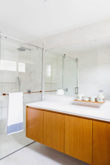 O armário foi projetado em lâmina natural de madeira e sem fundo, trazendo um toque moderno sem perder a conexão com a materialidade existente. Na execução do projeto, cada detalhe foi pensado para unir funcionalidade e encanto. Os toalheiros do banheiro foram desenhados por nós, e uma ducha manual no box facilita a hora do banho, permitindo também o enchimento da banheira de forma prática. O monocomando foi estrategicamente posicionado no lado oposto ao chuveiro, proporcionando mais comodidade ao acionar o chuveiro. Além disso, uma papeleira embutida em mármore e uma prateleira discreta na bancada proporcionam organização e praticidade.